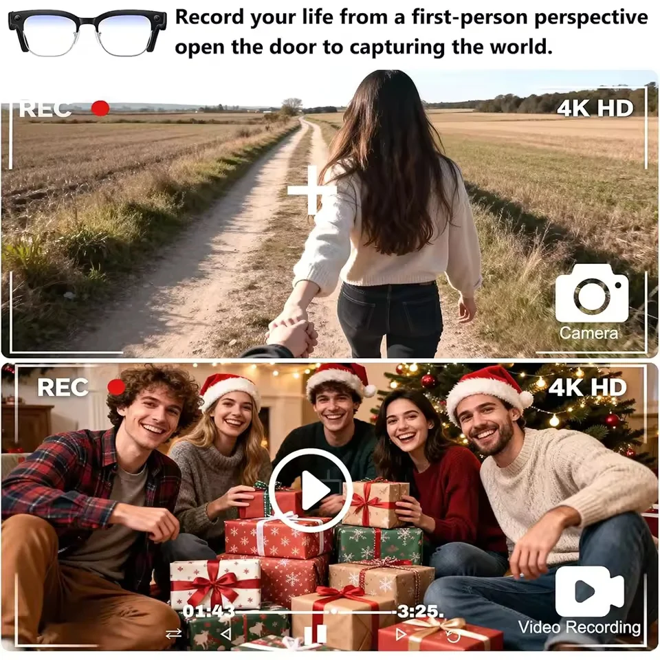 Experience next-generation wearable technology with these 2026 New 4K Smart Camera Glasses designed for both men and women. Equipped with a high-resolution 4K camera, they allow you to record clear and vivid videos hands-free. The powerful 800W camera system captures important moments during travel, meetings, sports, or daily activities. Built-in AI translation supports over 120 languages, making communication easier wherever you go. The integrated Bluetooth function enables wireless music playback for entertainment on the move. Featuring a large 3600mAh battery, the glasses also function as a portable power bank for added convenience. The long battery life ensures extended recording and usage time. Designed with a stylish and lightweight frame, they provide comfortable all-day wear. Easy-to-use controls allow quick access to recording, translation, and music functions. Ideal for business trips, outdoor adventures, and social interactions. The smart glasses combine video recording, language translation, and audio playback in one device. Durable construction ensures reliable performance in everyday use. Compatible with most smartphones for seamless connectivity. These multifunctional smart glasses offer innovation, practicality, and modern style in one advanced wearable device.